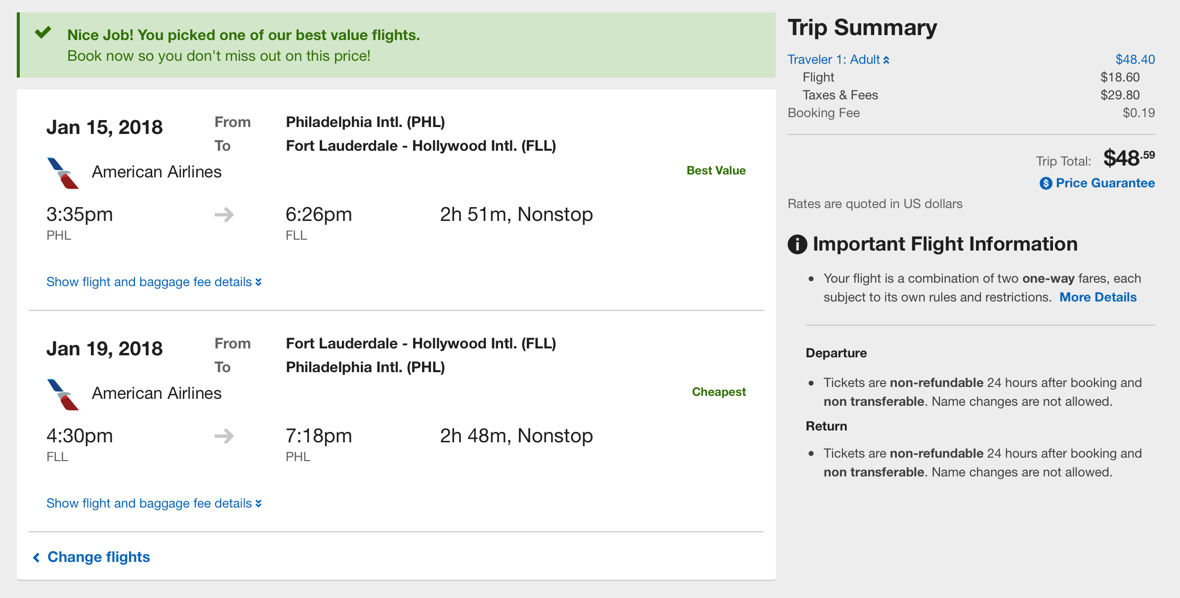 Philadelphia (PHL) to Ft. Lauderdale (FLL) on American for $49 round-trip via Orbitz:
