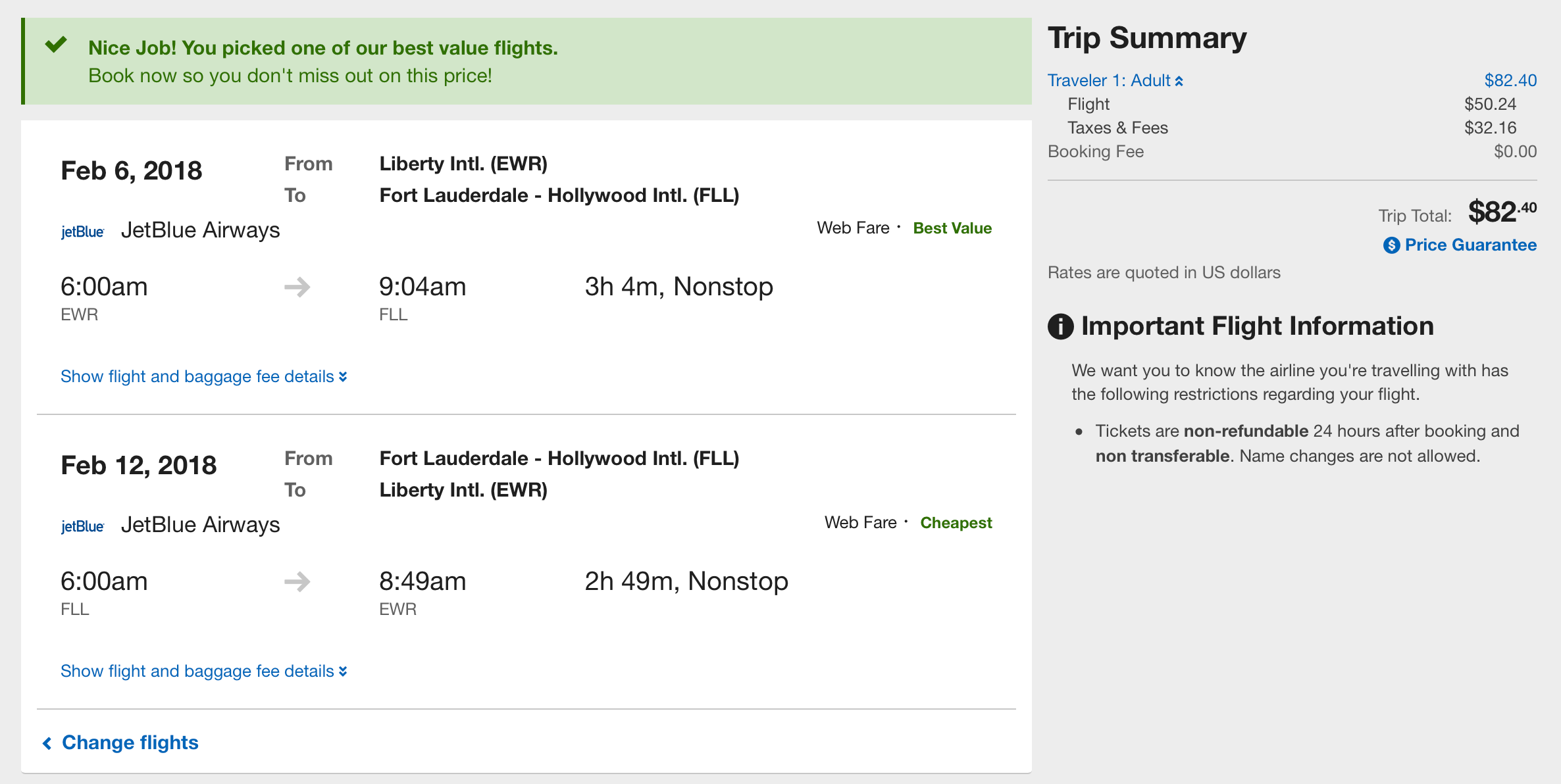 New York/Newark (EWR) to Ft. Lauderdale (FLL) on JetBlue for $82 round-trip via Orbitz:
