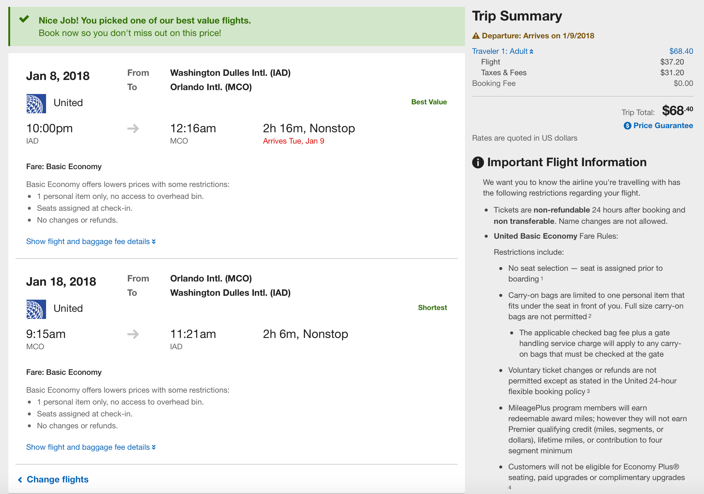 Washington, DC (IAD) to Orlando (MCO) on United for $68 round-trip via Orbitz: