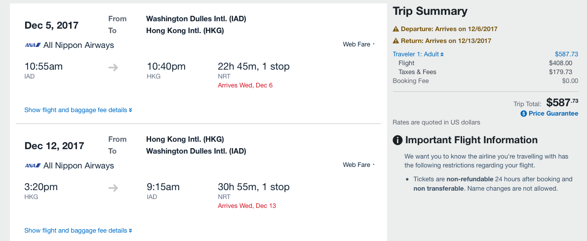 Washington DC (IAD) to Hong Kong (HKG) for $588 round-trip on ANA via Orbitz: