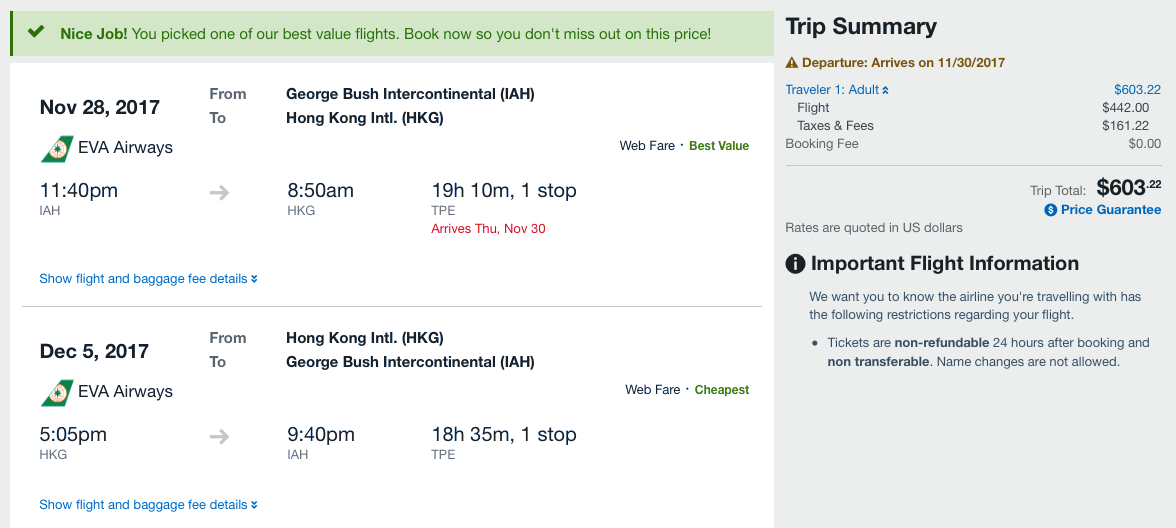 Houston (IAH) to Hong Kong (HKG) for $603 round-trip on EVA Air via Orbitz: