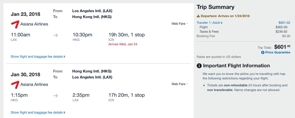 Los Angeles (LAX) to Hong Kong (HKG) for $602 round-trip on Asiana via Orbitz:
