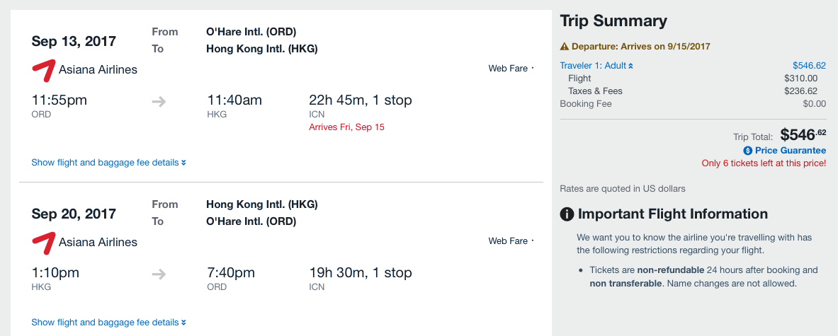 Chicago (ORD) to Hong Kong (HKG) for $547 round-trip on Asiana via Orbitz: