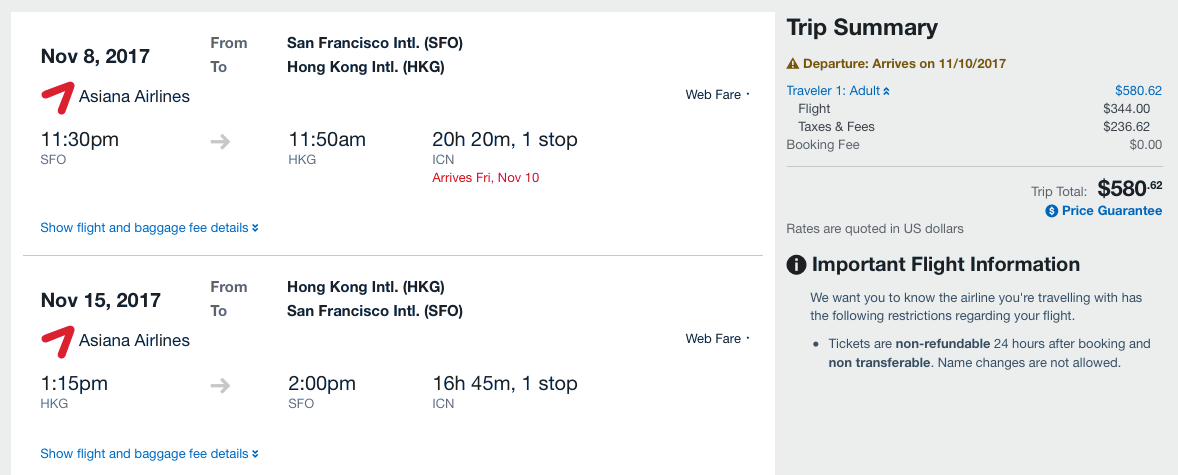 San Francisco (SFO) to Hong Kong (HKG) for $581 round-trip on Asiana via Orbitz: