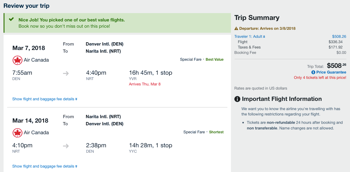 Denver (DEN) to Tokyo, Japan (NRT) for $508 round-trip via Orbitz: