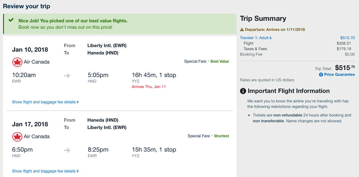 New York/Newark (EWR) to Tokyo (HND) for $516 round-trip via Orbitz: