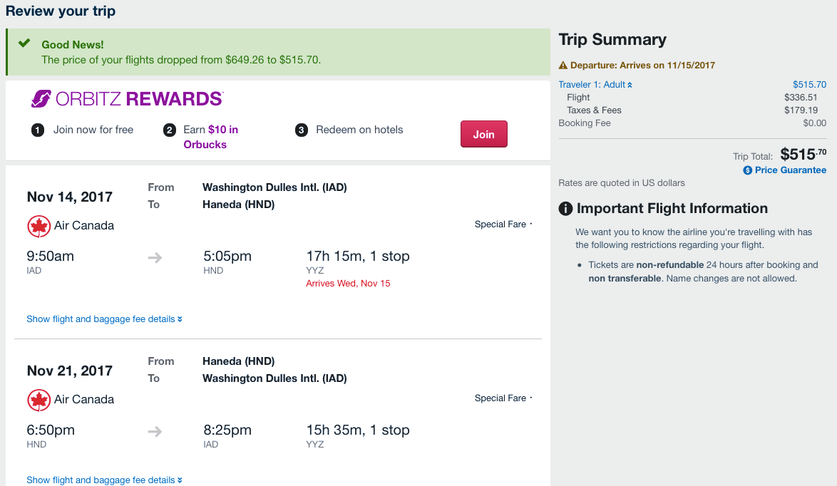 Washington, DC (IAD) to Tokyo (HND) for $516 round-trip via Orbitz: