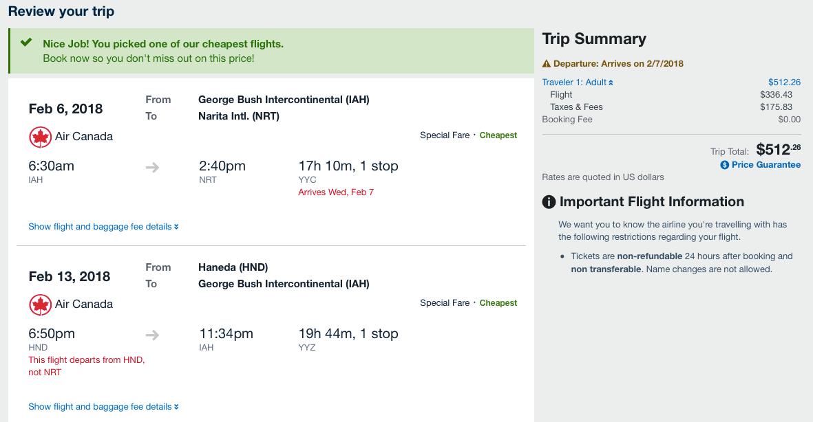 Houston (IAH) to Tokyo (TYO) for $512 round-trip via Orbitz: