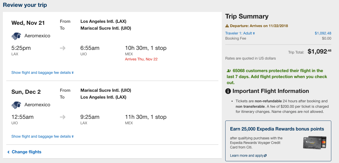 Los Angeles (LAX) to Quito (UIO) on Aeromexico for $1,093 round-trip in business during Thanksgiving: