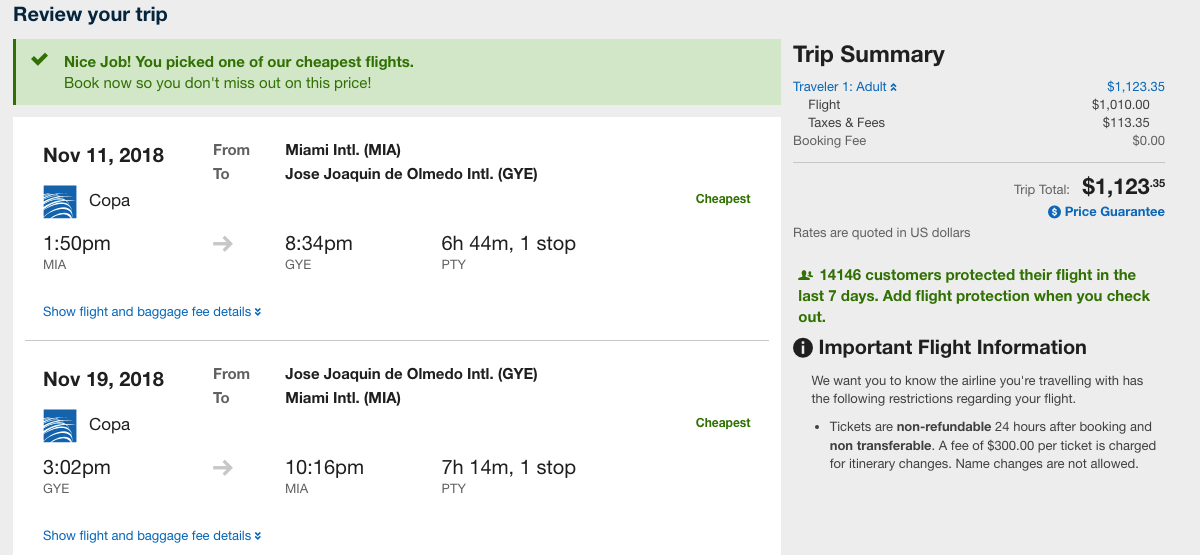 Miami (MIA) to Guayaquil (GYE) on Copa for $1,124 round-trip in business: