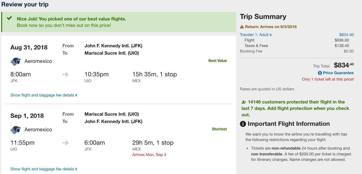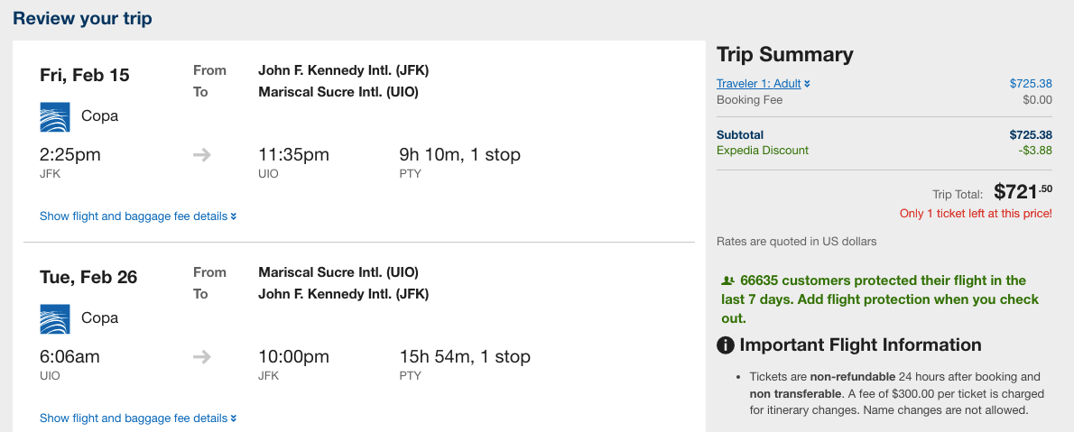 Airfare deals are typically only available on limited dates. We recommend you use Google Flights to find dates to fly, then book through an online travel agency such as Orbitz or Expedia, which allows you to cancel flights without penalty by 11pm Eastern Time within one day of booking. However, if you're using The Platinum Card® from American Express, you'll need to book directly with the airline or through Amex Travel portal to get 5x MR points. Remember: Fares may disappear quickly, so book right away and take advantage of Orbitz or Expedia's courtesy cancellation if you're unable to get the time away from work or family.