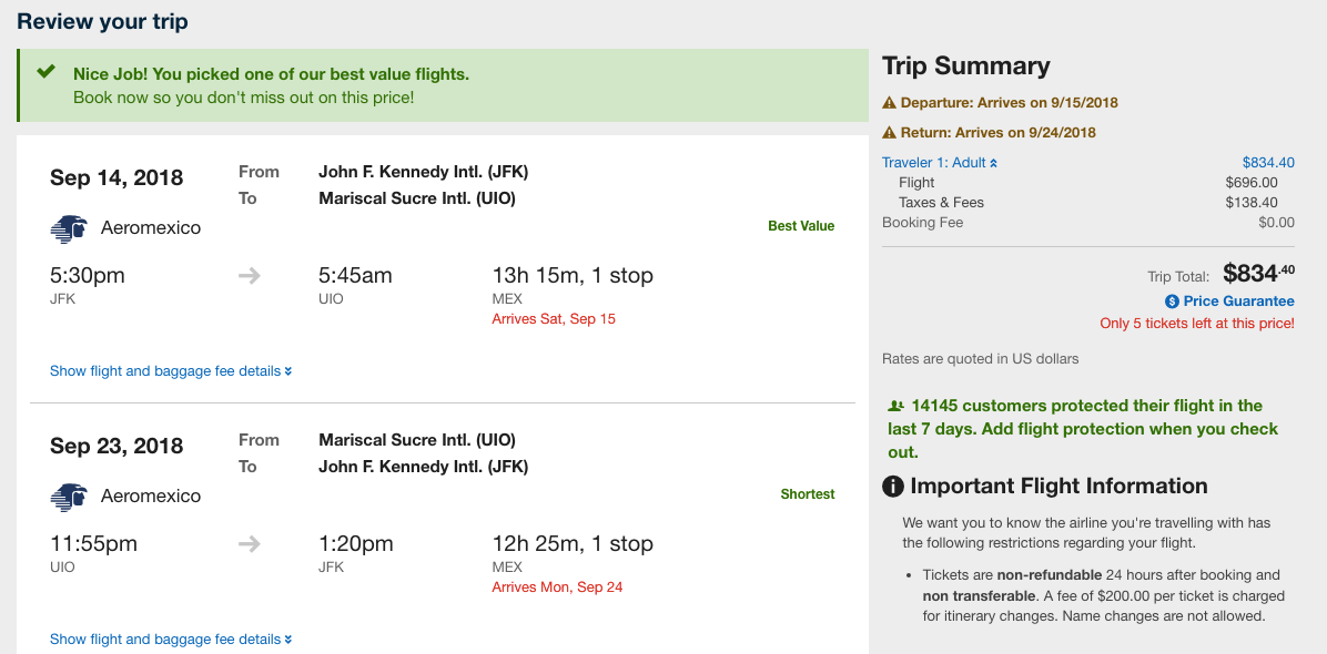 New York (JFK) to Quito (UIO) on Aeromexico for $835 round-trip in business (weekend mileage run):