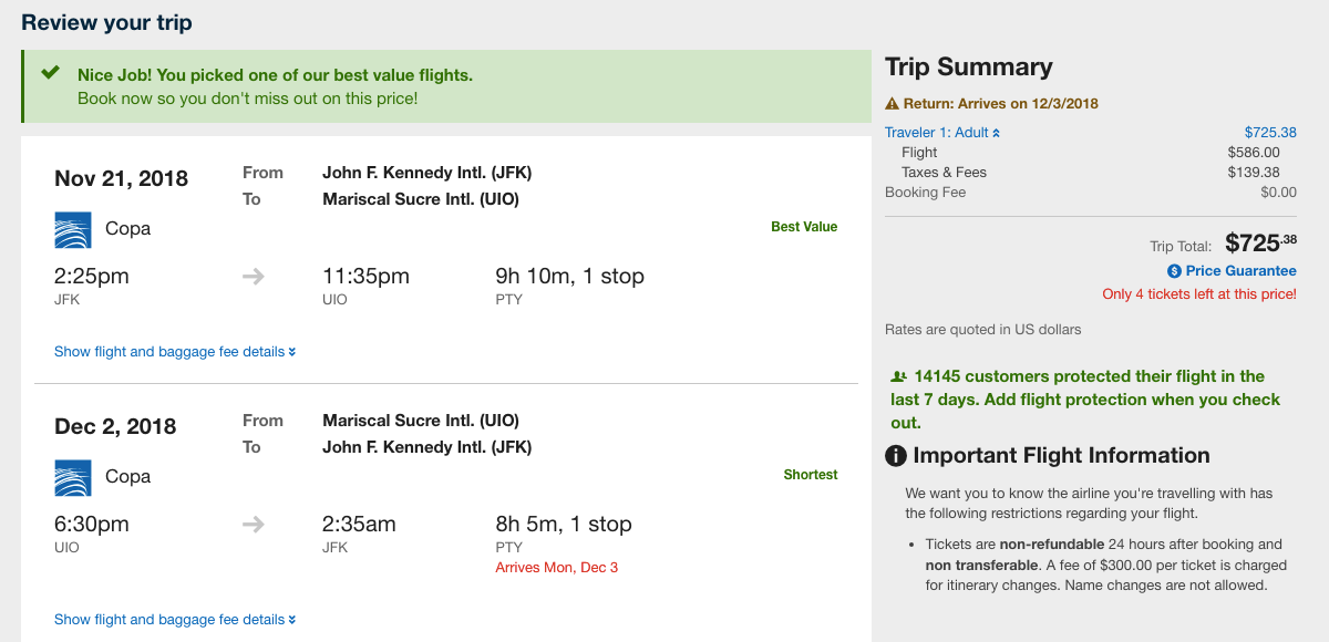 New York (JFK) to Quito (UIO) on Copa for $726 round-trip in business class during Thanksgiving: