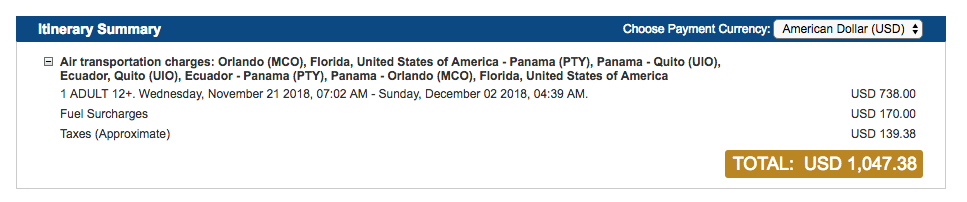 Orlando (MCO) to Quito (UIO) on Copa for $1,048 round-trip in business during Thanksgiving
