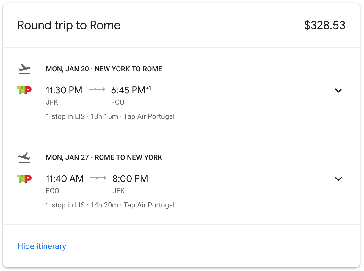 New York (JFK) to Rome (FCO) for $329 round-trip on TAP Portugal via Priceline on Google Flights:
