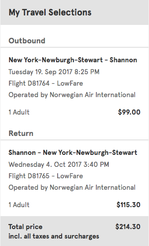 Newburgh, NY (SWF) to Shannon (SNN) for $214 round-trip in September: