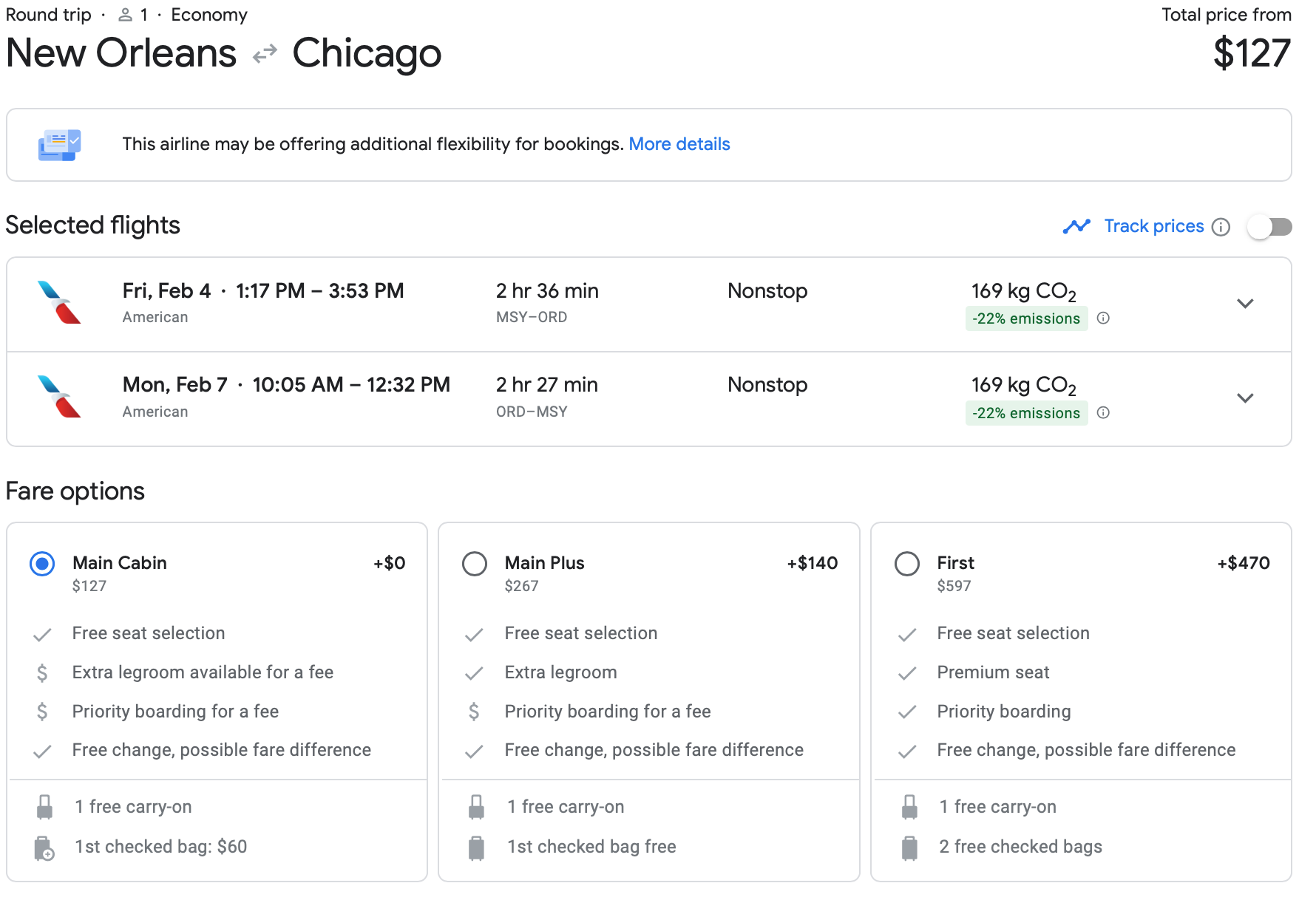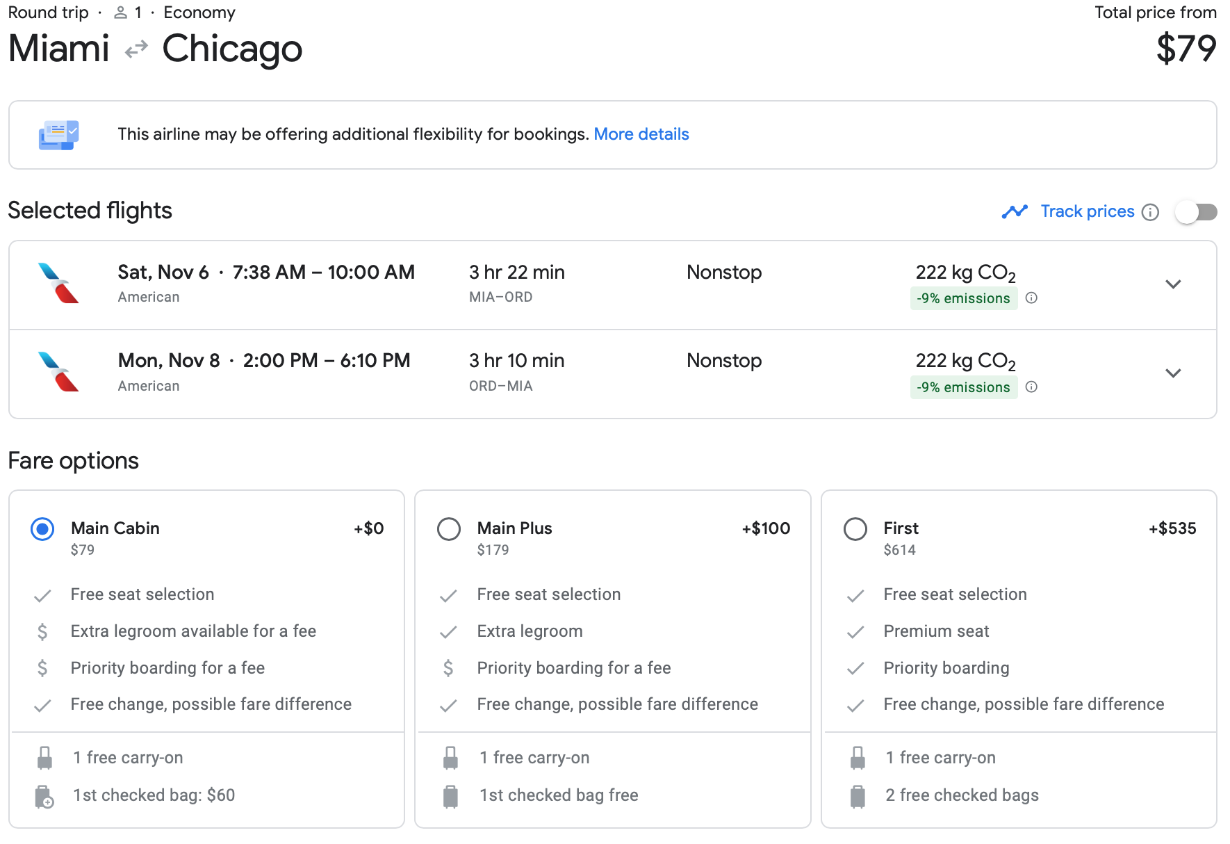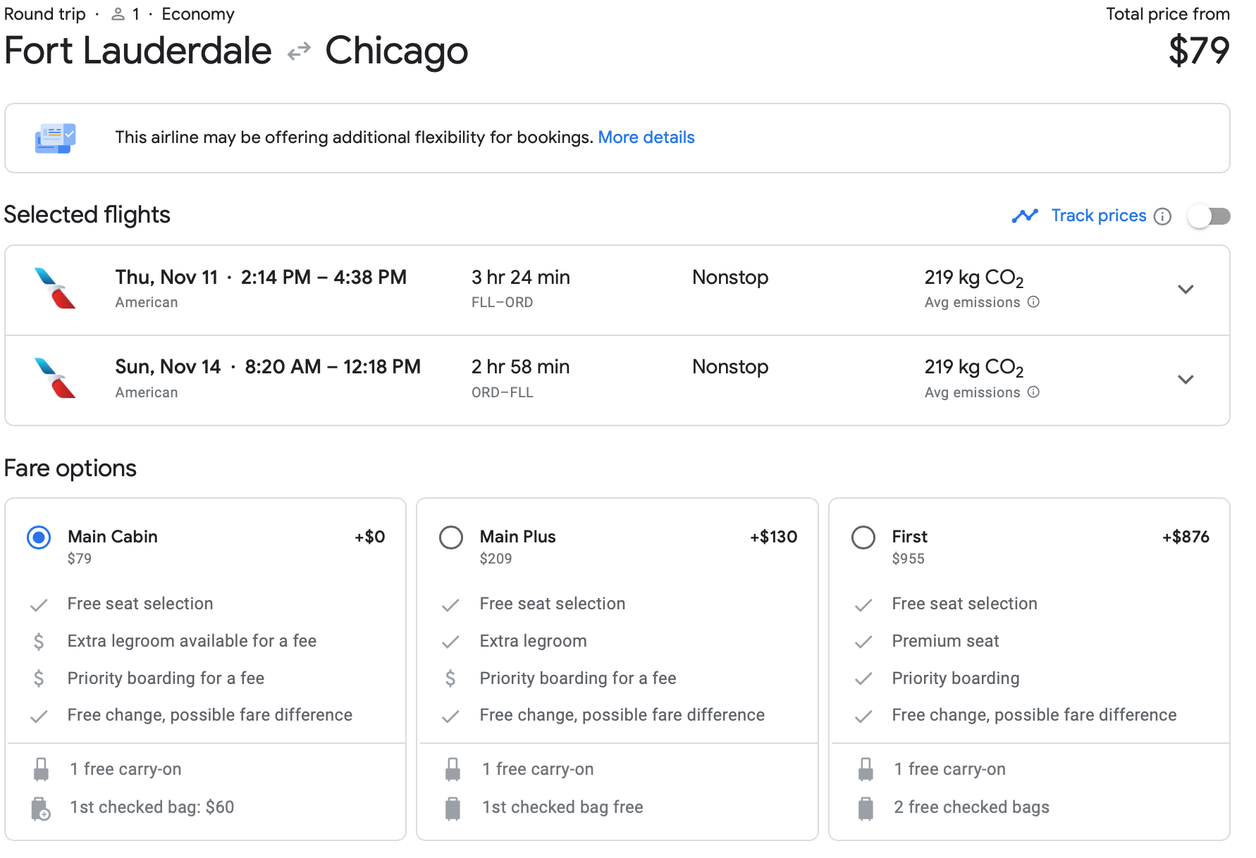 The fares offered by American and United are Main Cabin, which come with a free carry-on bag and seat assignment. The other flights in this offer are for Basic Economy seats. Many of the best prices we found were departure flights out of Florida, like this dirt-cheap price for a flight out of Fort Lauderdale (FLL) to Chicago for just $79 for a Main Cabin seat.