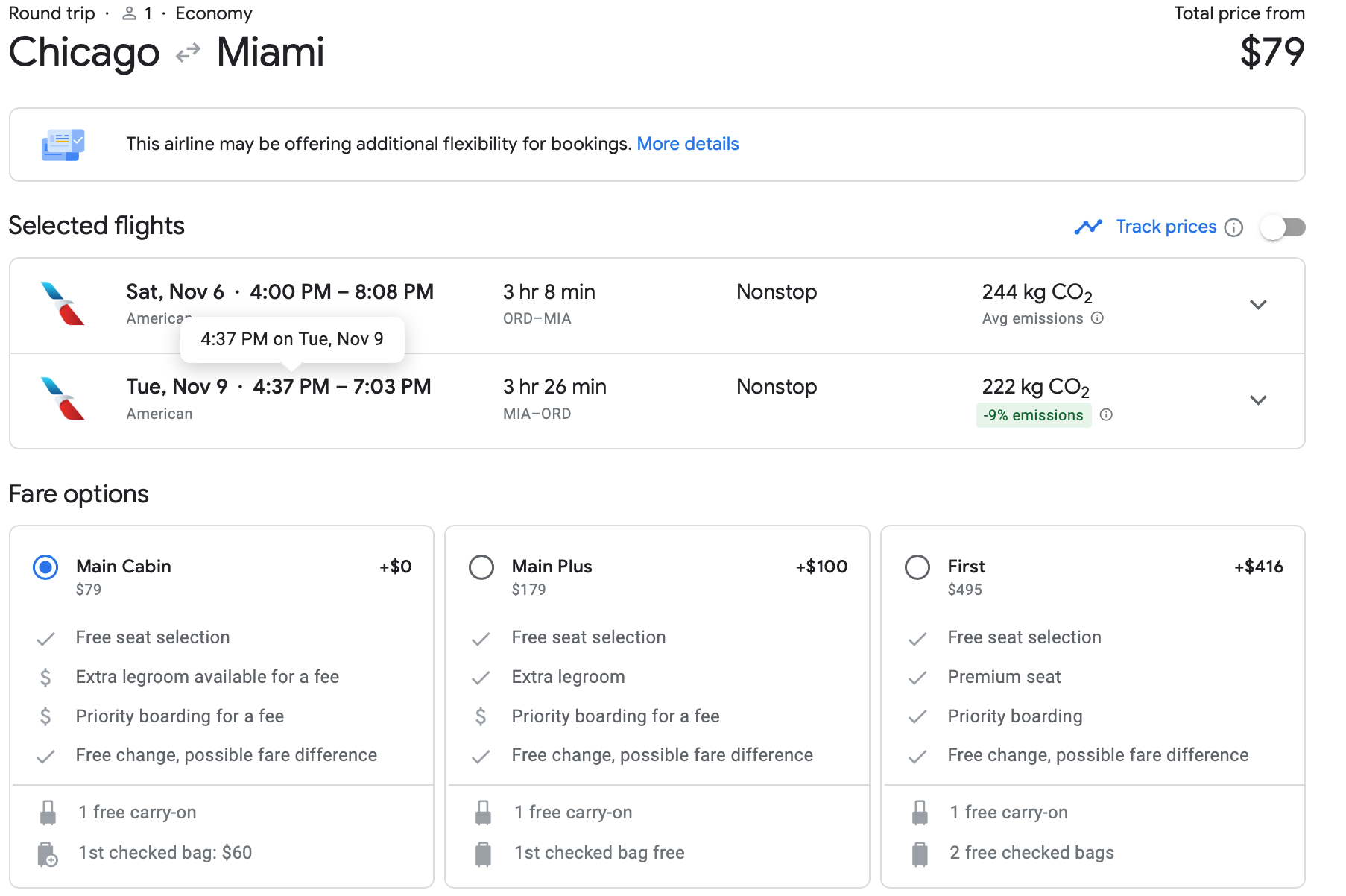 Another rock-bottom Florida fare that we found departed from Miami International Airport (MIA) to O'Hare, also from American for a Main Cabin seat and also costing just $79 roundtrip.