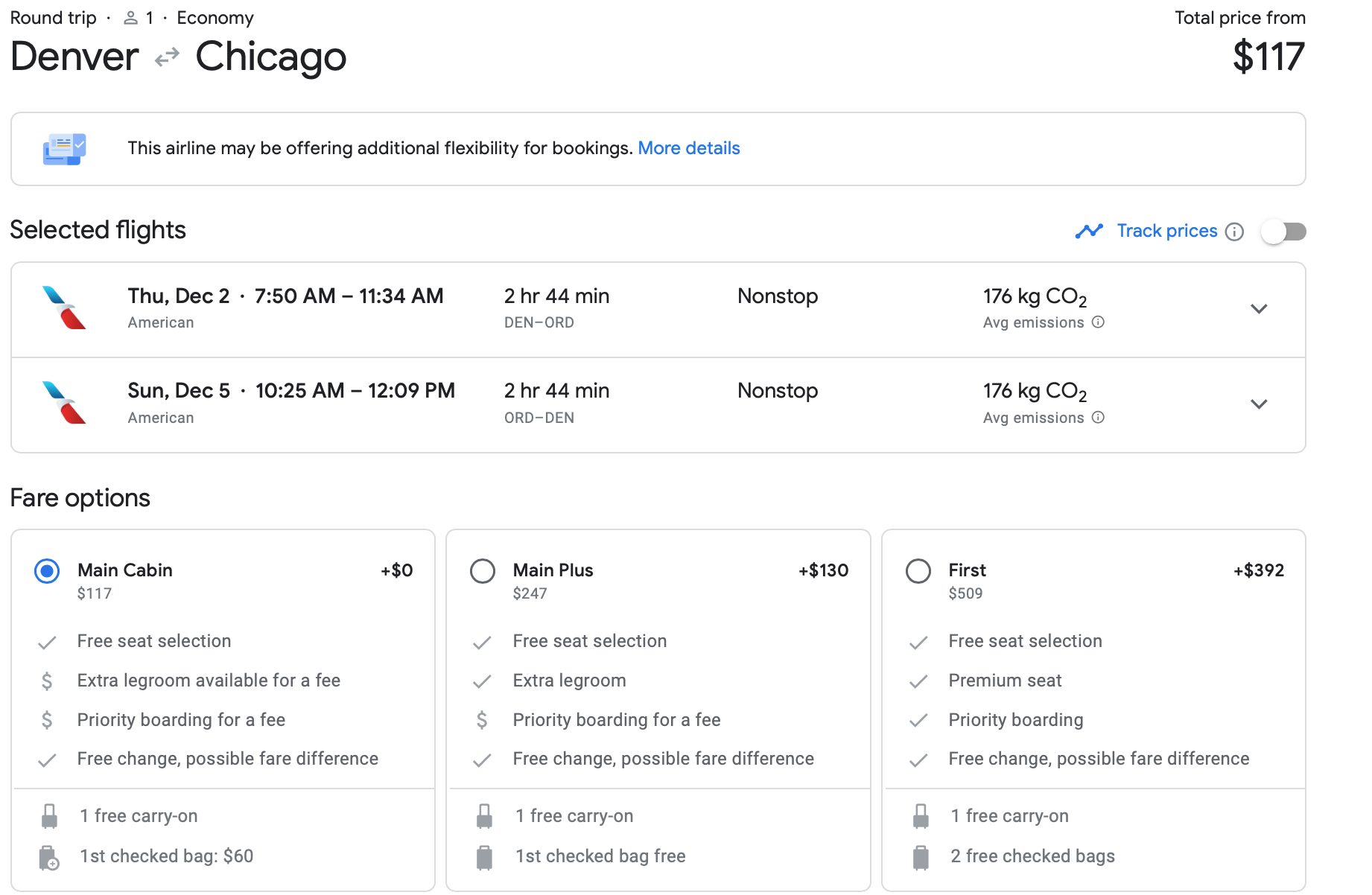 Travelers out west will also want to consider a long weekend to Chicago when they see some of the available prices. Denver (DEN) to Illinois is another example of a great price, just $117! The best availability we found at that price was for early December flights, again through American.