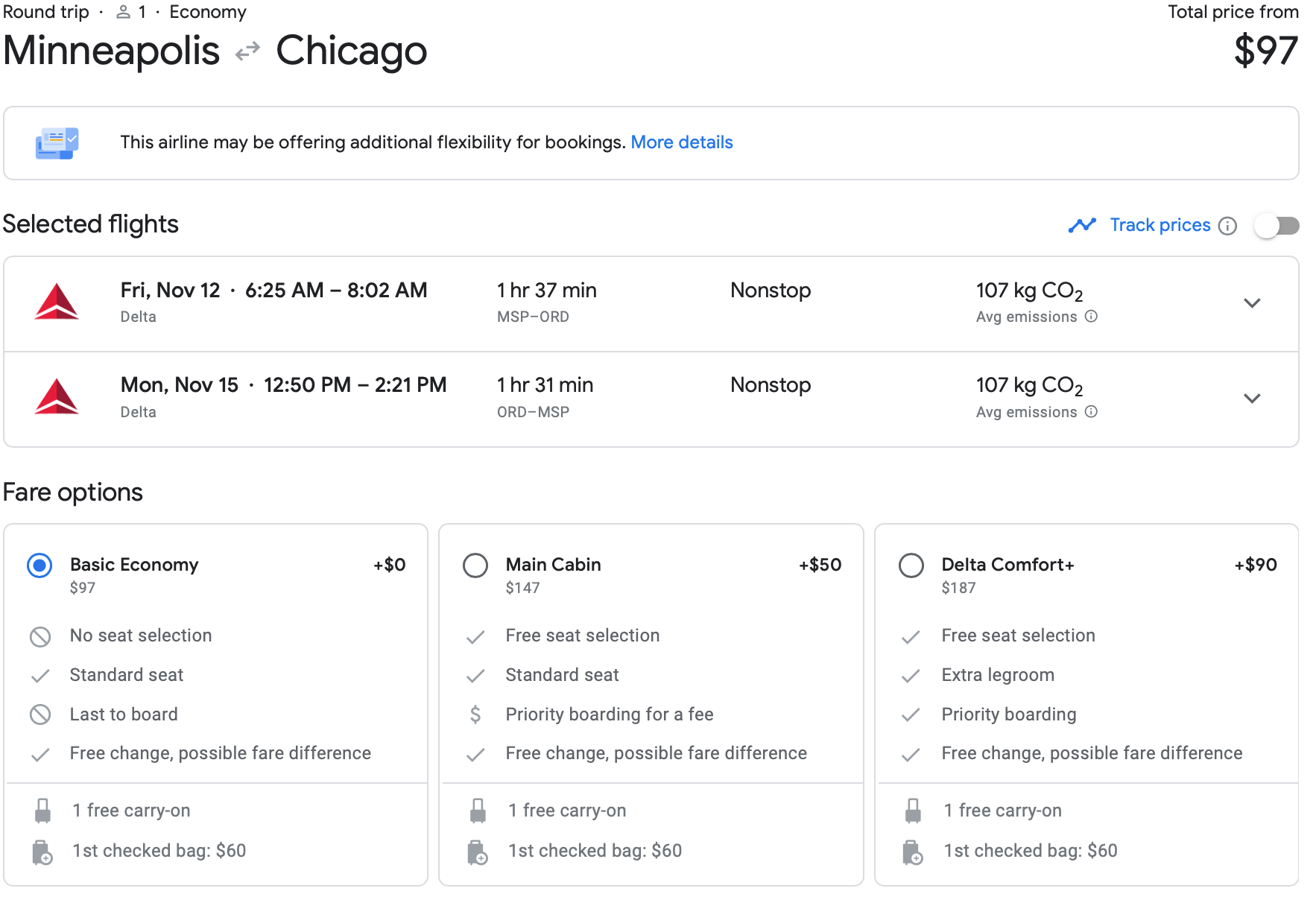 Almost all the best prices and availability in this deal we found were with American, but we found a Delta deal from Minneapolis to Chicago for just $97 nonstop.