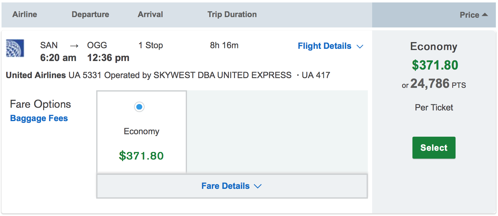 San Diego (SAN) to Maui (OGG) for $372 round-trip or 24,786 UR points in January 2019 via Chase Ultimate Rewards portal: