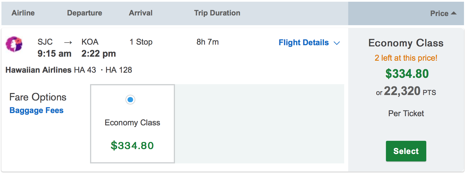 San Jose (SJC) to Kona (KOA) for $335 round-trip or 22,320 UR points in August via Chase Ultimate Rewards portal: