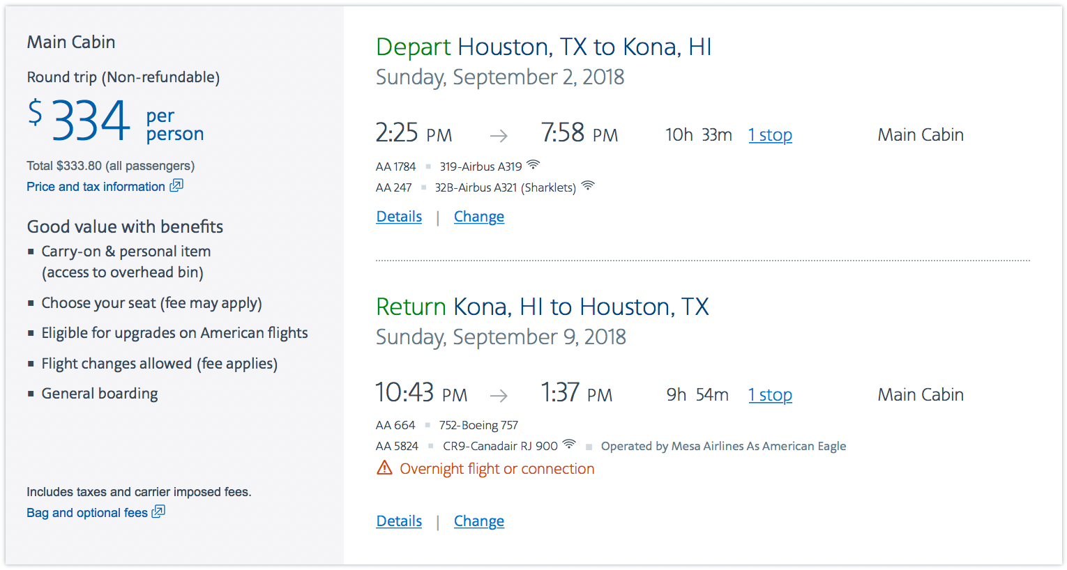 Houston (IAH) to Kona (KOA) for $334 round-trip in September on American: