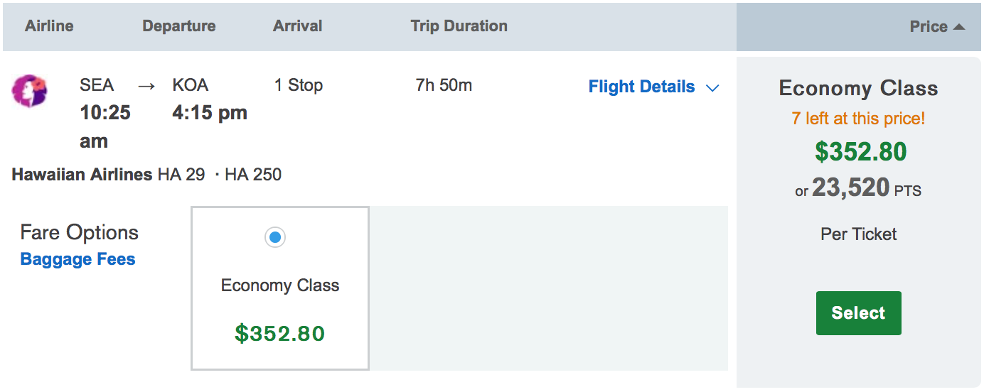 Seattle (SEA) to Kona (KOA) for $353 round-trip or 23,520 UR points in December via Chase Ultimate Rewards portal: