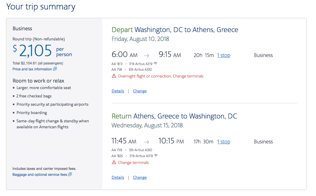 Washington, DC (DCA) to Athens (ATH) for $2,105 round-trip in business class on American: