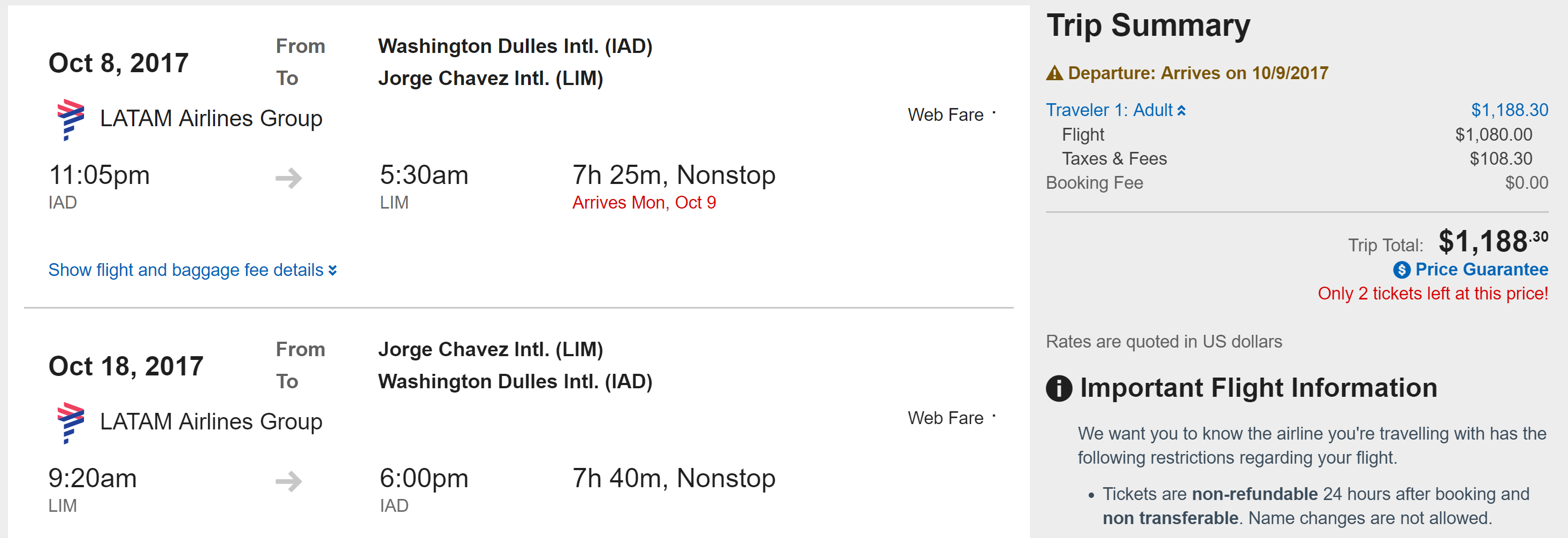 Washington DC (IAD) to Lima (LIM) for $1,188 round-trip in October: