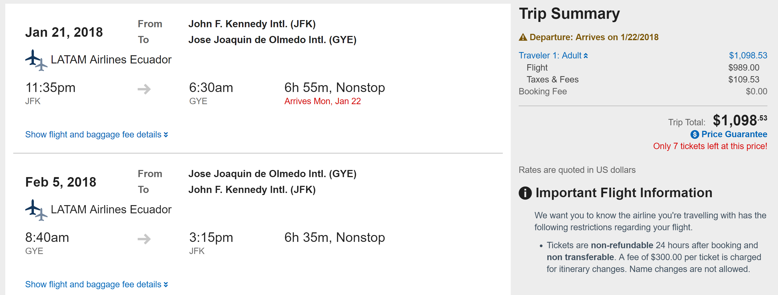 New York (JFK) to Guayaquil (GYE) for $1,099 round-trip in January: