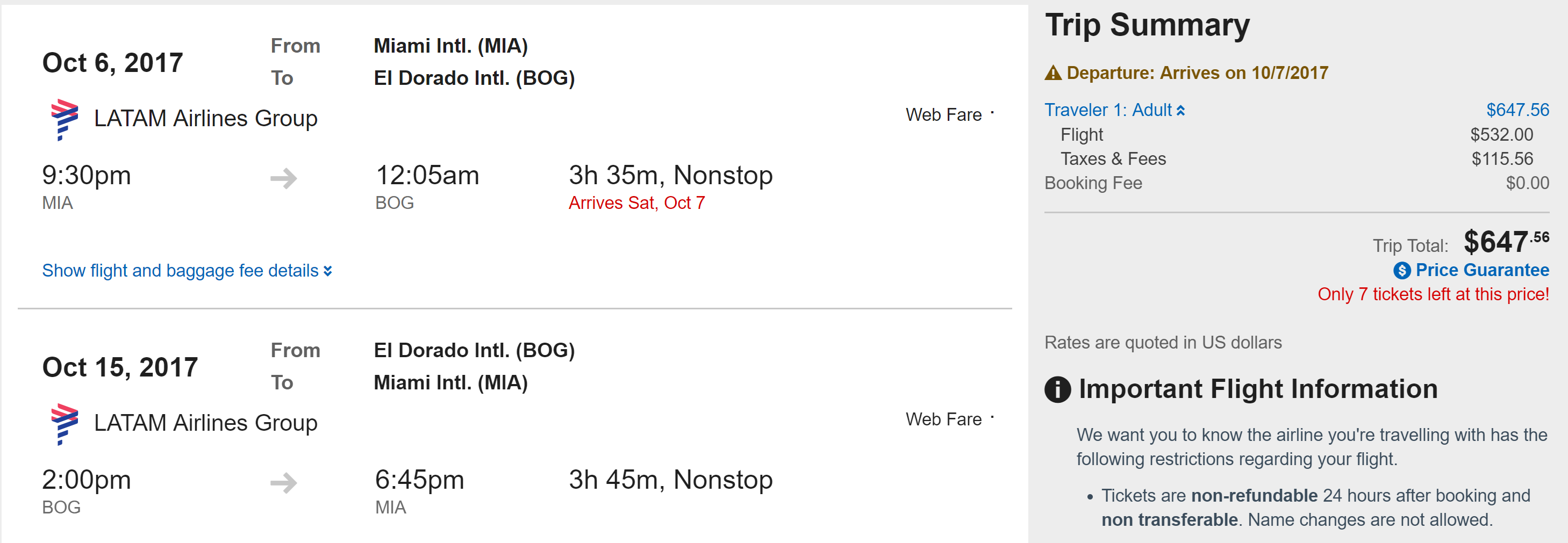 Miami (MIA) to Bogota (BOG) for $648 round-trip nonstop in October: