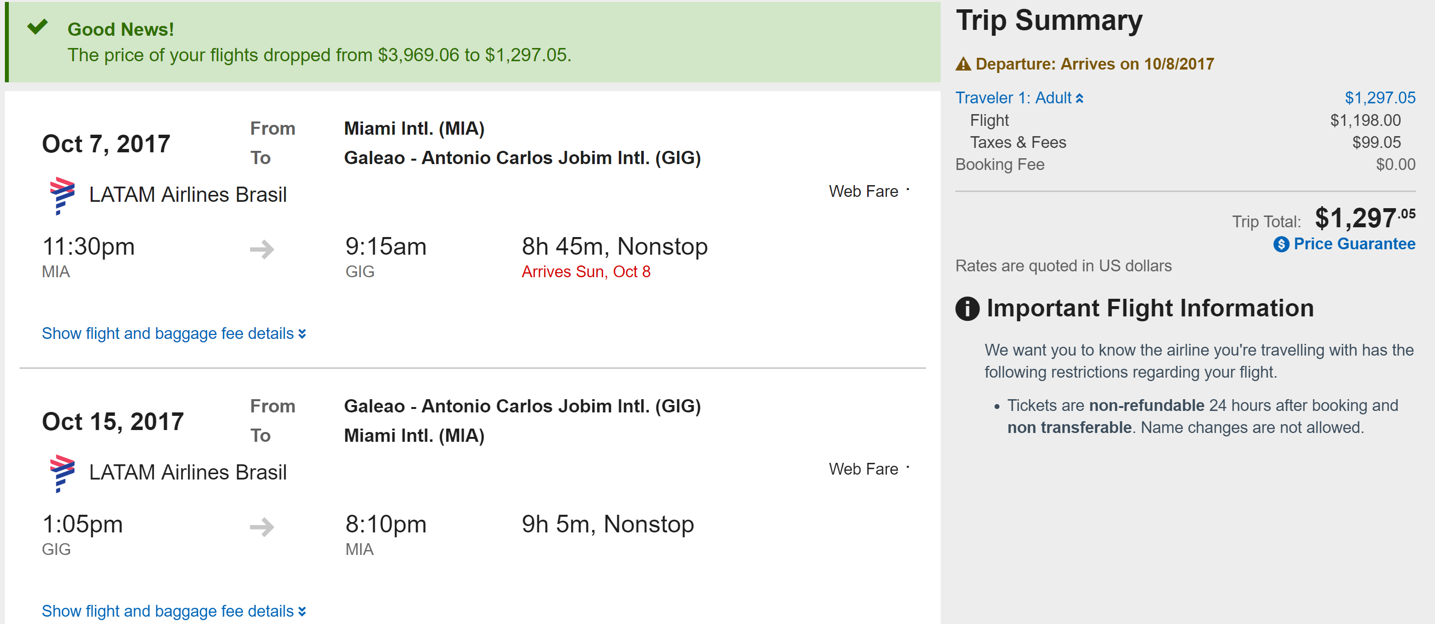 Miami (MIA) to Rio de Janeiro (GIG) for $1,297 round-trip in October: