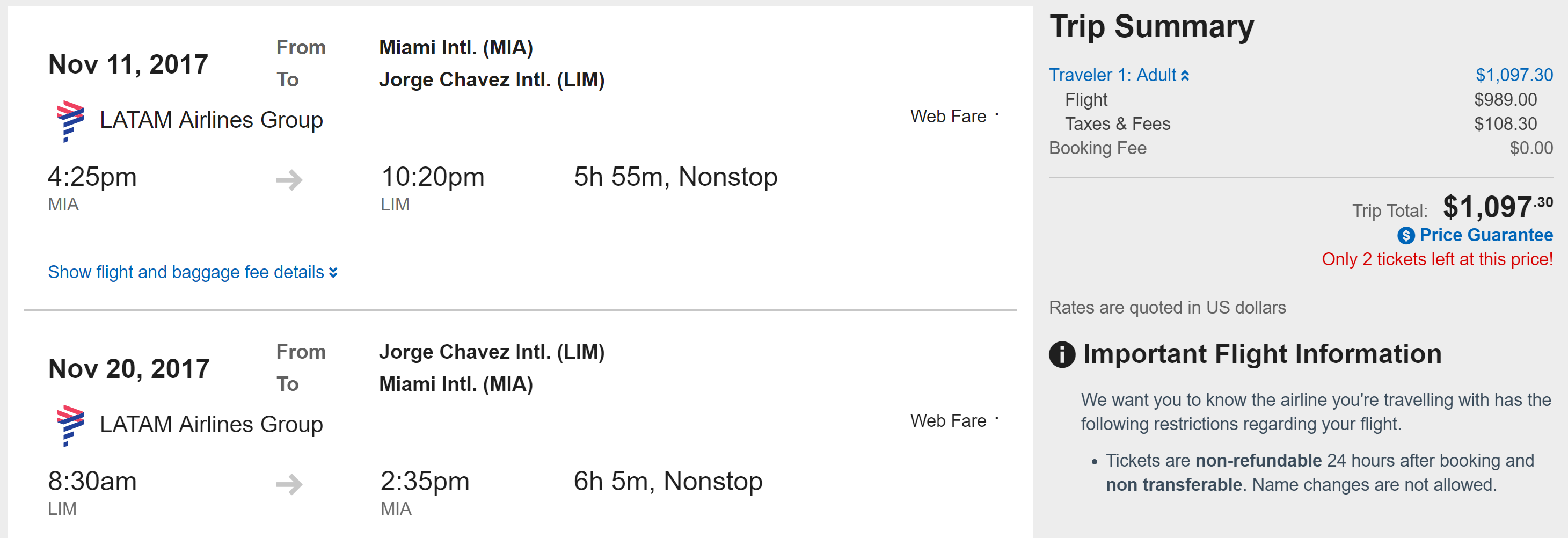 Miami (MIA) to Lima (LIM) for $1,097 round-trip nonstop in November: