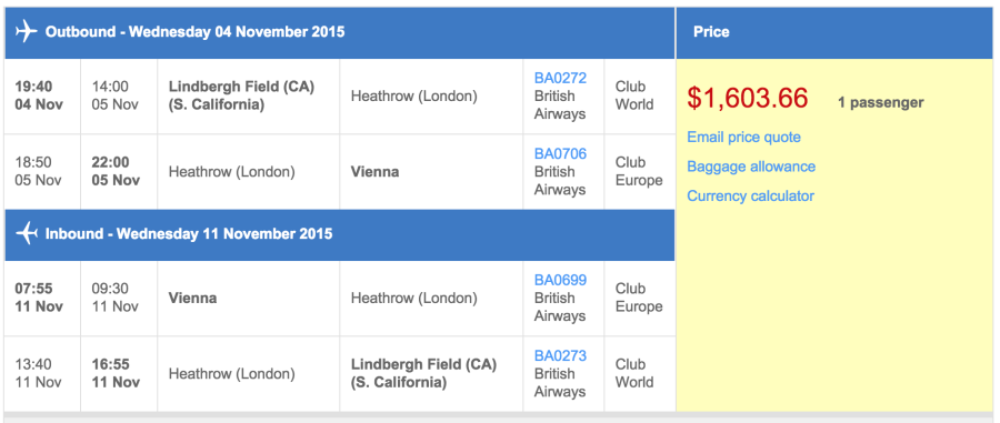 San Diego (SAN) to Vienna (VIE) in business class on British Airways for $1,604: