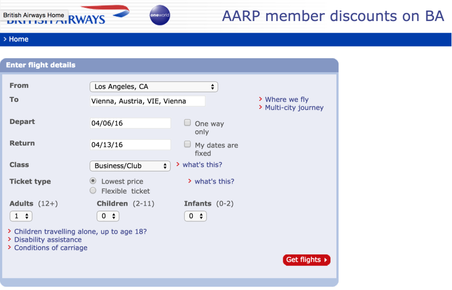 Step 1: Head to AARP's British Airways discount page to save $400 off this flight (per person). You do need to be an AARP member, but anyone can join for $16 per year (as low as $12.60 per year if you pay $63 for a five-year membership). Log in to verify your membership and click through to British Airways.