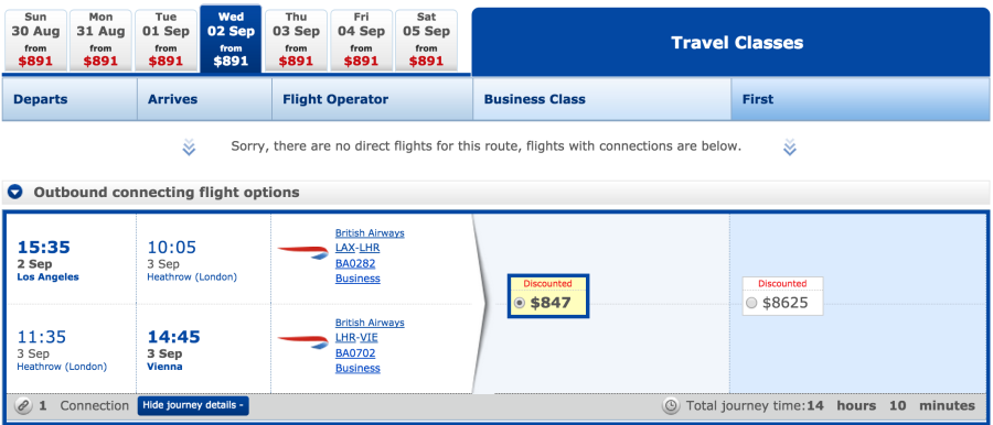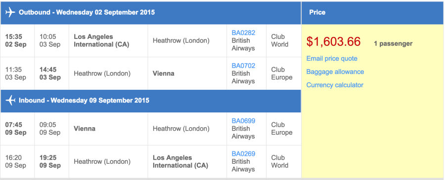 Los Angeles (LAX) to Vienna (VIE) in business class on British Airways for $1,604: