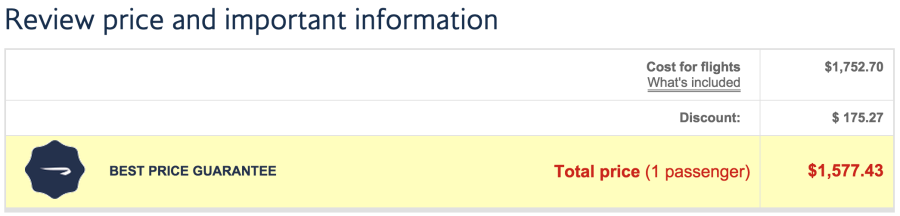 Step 5: Review your fare and click through to purchase. If all goes well, you should see an additional 10% discount applied, dropping the fare by $175 to $1,577. Confirm all flight details — you can cancel for a full refund within 24 hours of purchase, or you can cancel any time before departure for a $500 fee.