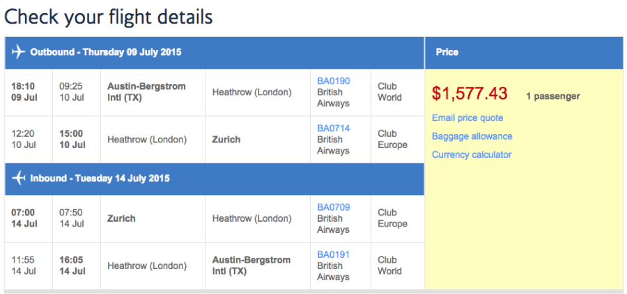Austin (AUS) to Zurich (ZRH) in business class on British Airways for $1,577: