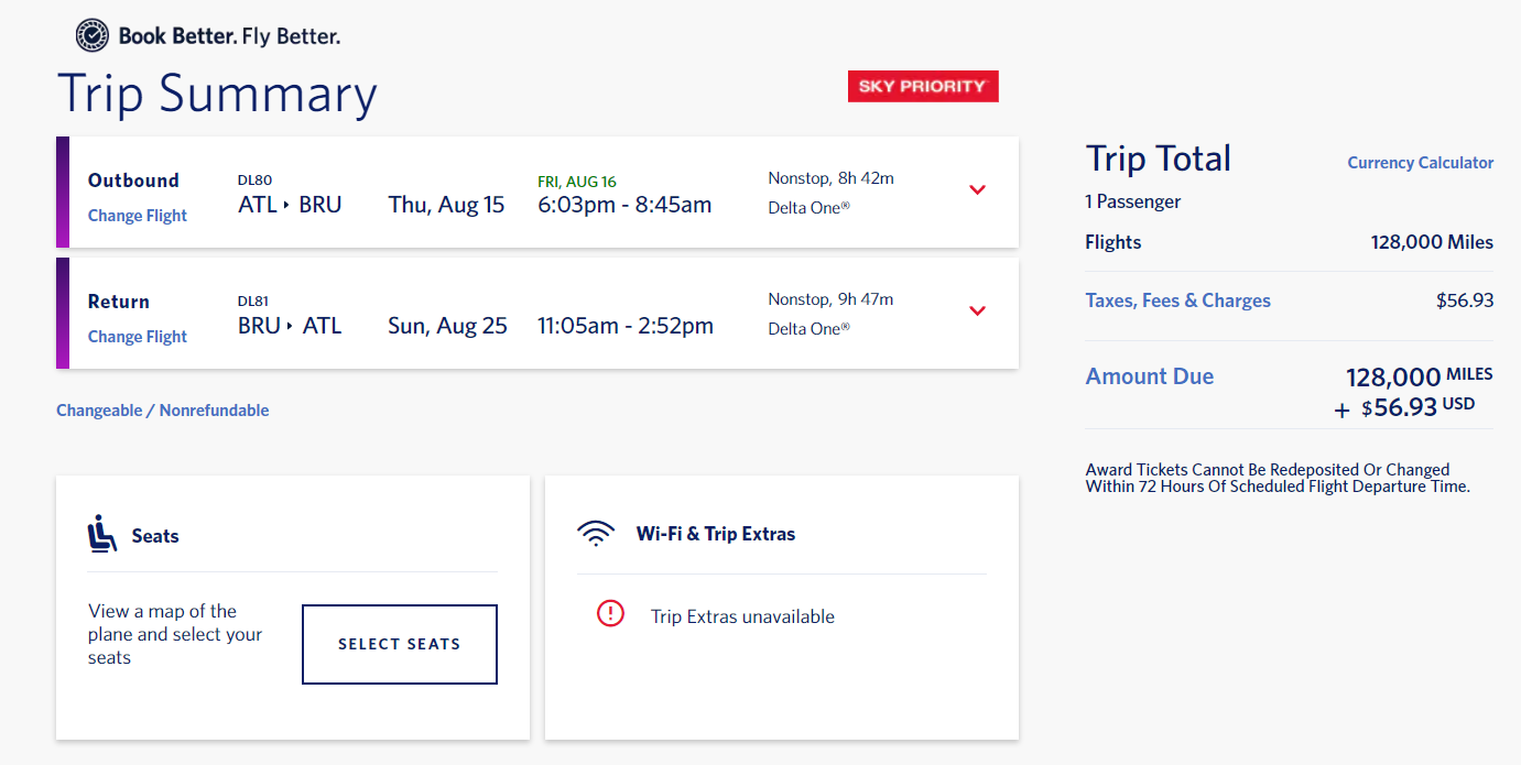 Atlanta (ATL) to Brussels (BRU) for 128,000 miles + $57 in taxes and fees round-trip nonstop in business class via Delta: