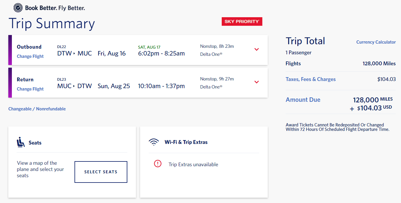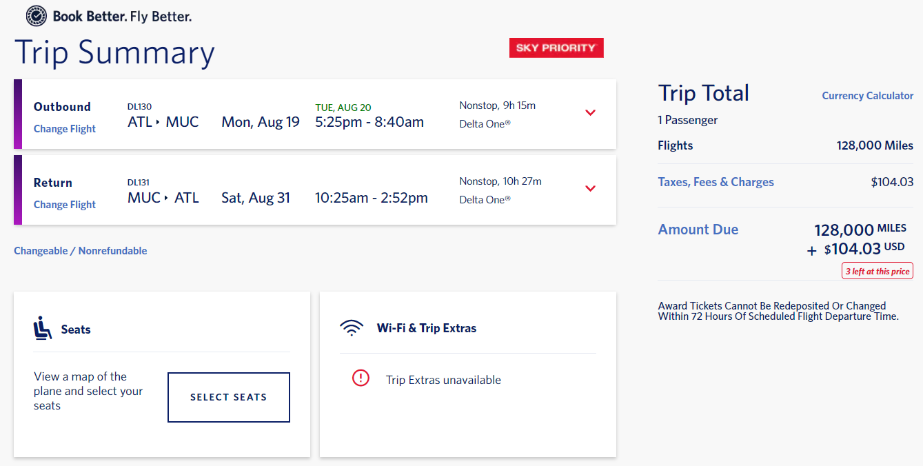 Detroit (DTW) to Munich (MUC) for 128,000 miles + $104 in taxes and fees round-trip nonstop in business class via Delta: