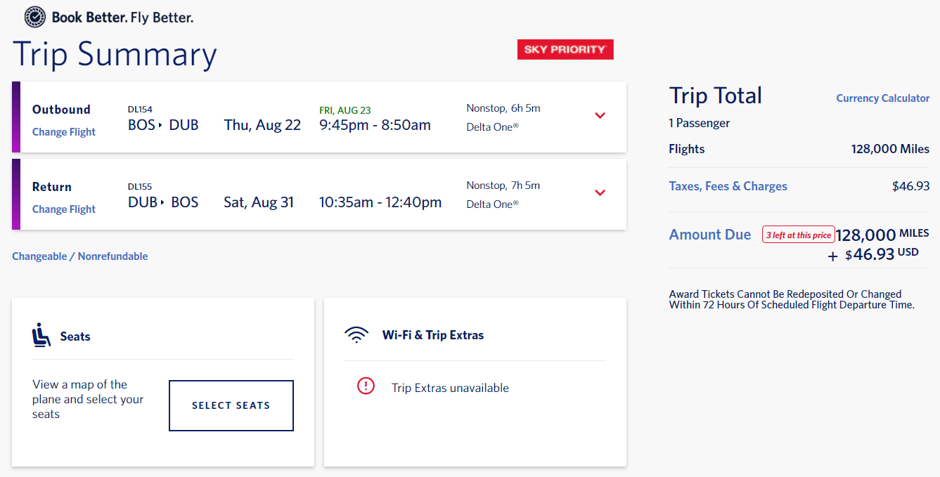 Boston (BOS) to Dublin (DUB) for 128,000 miles + $47 in taxes and fees round-trip nonstop in business class via Delta: