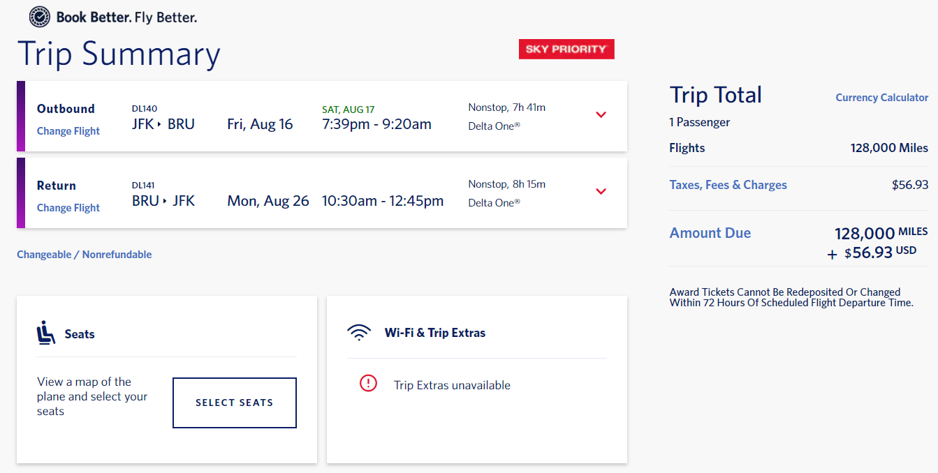 New York Kennedy (JFK) to Brussels (BRU) for 128,000 miles + $57 in taxes and fees round-trip nonstop in business class via Delta: