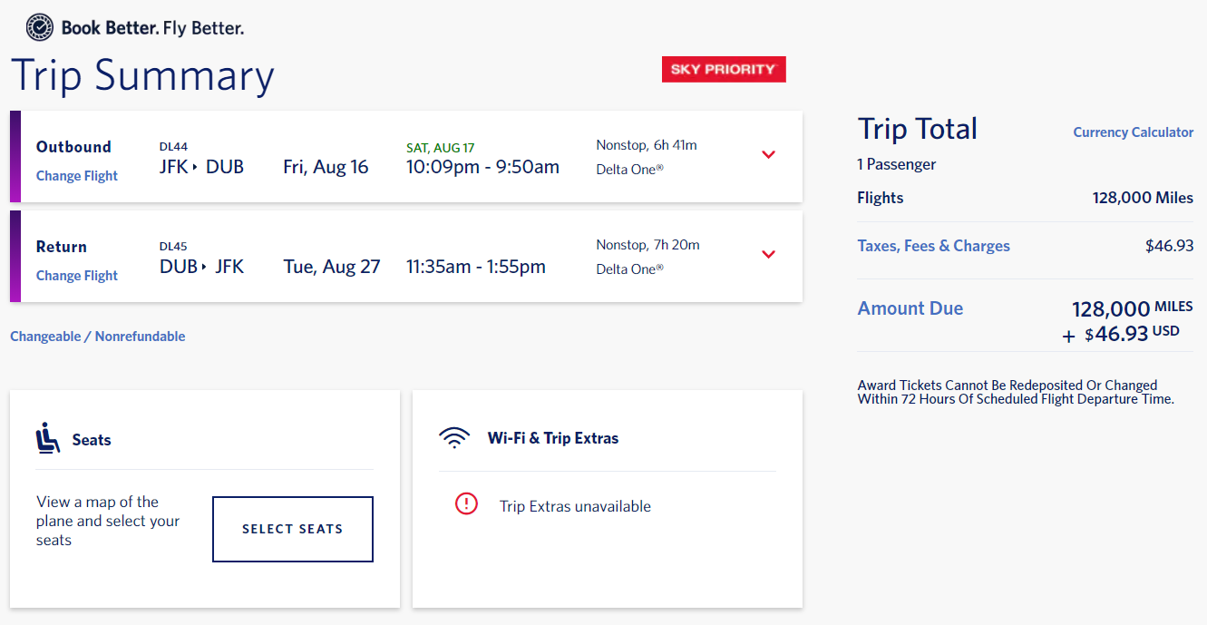 New York Kennedy (JFK) to Dublin (DUB) for 128,000 miles + $47 in taxes and fees round-trip nonstop in business class via Delta: