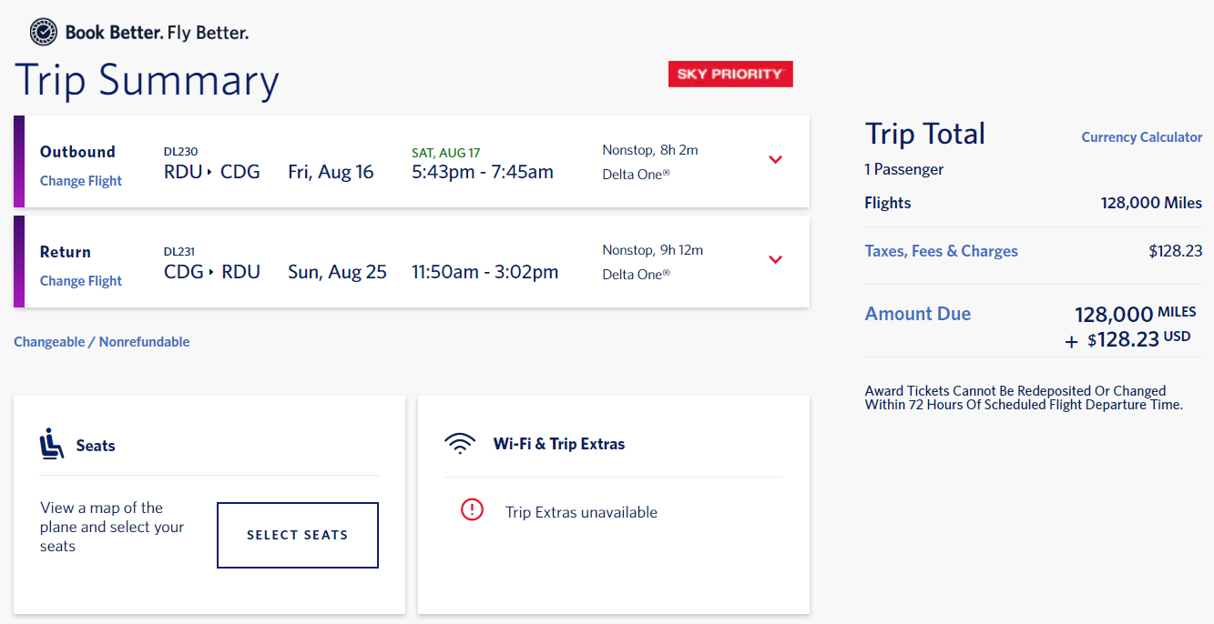 Raleigh/Durham (RDU) to Paris (CDG) for 128,000 miles + $128 in taxes and fees round-trip nonstop in business class via Delta: