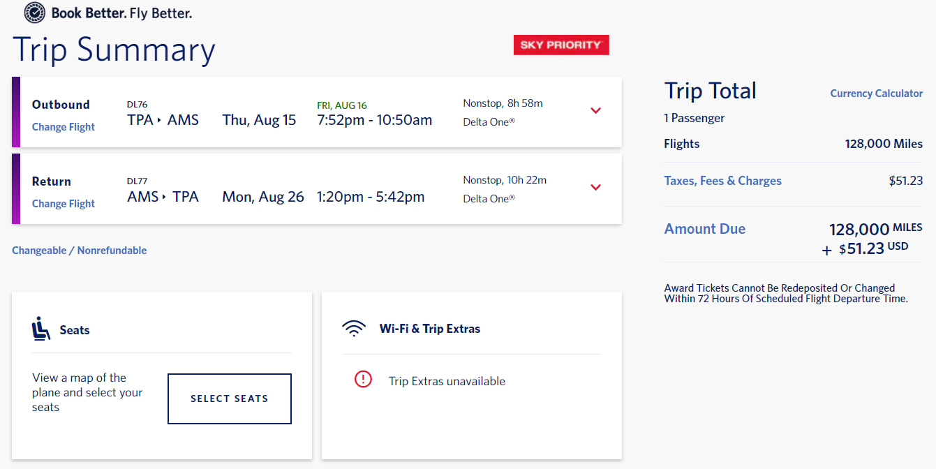 Tampa (TPA) to Amsterdam (AMS) for 128,000 miles + $51 in taxes and fees round-trip nonstop in business class via Delta: