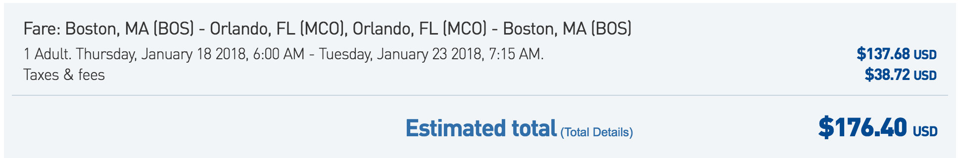 Boston (BOS) to Orlando (MCO) for $176 round-trip on JetBlue: