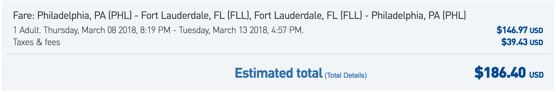 Philadelphia (PHL) to Fort Lauderdale (FLL) for $186 round-trip on JetBlue: