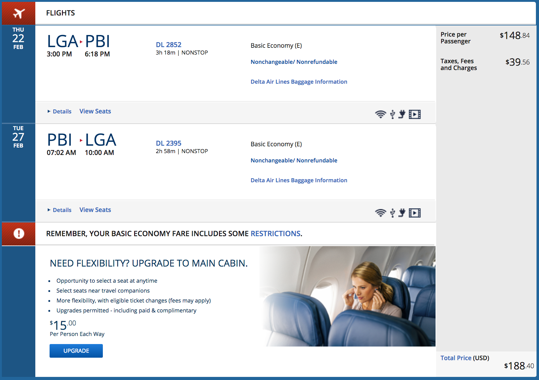 New York (LGA) to West Palm Beach (PBI) for $188 round-trip on Delta (basic economy)