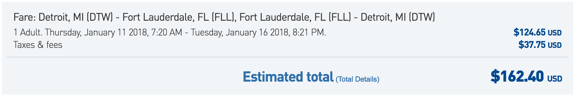 Detroit (DTW) to Fort Lauderdale (FLL) for $162 round-trip on JetBlue: